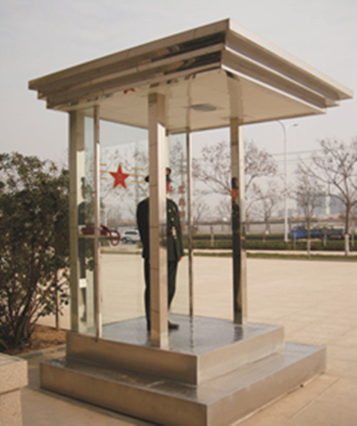 簡介—— 玻璃崗亭的工藝:立柱用80x80x1.5mm不銹鋼立柱,地板為3mm防滑鋁板,外封板為1.2mm不銹鋼板,吊頂為高級PV